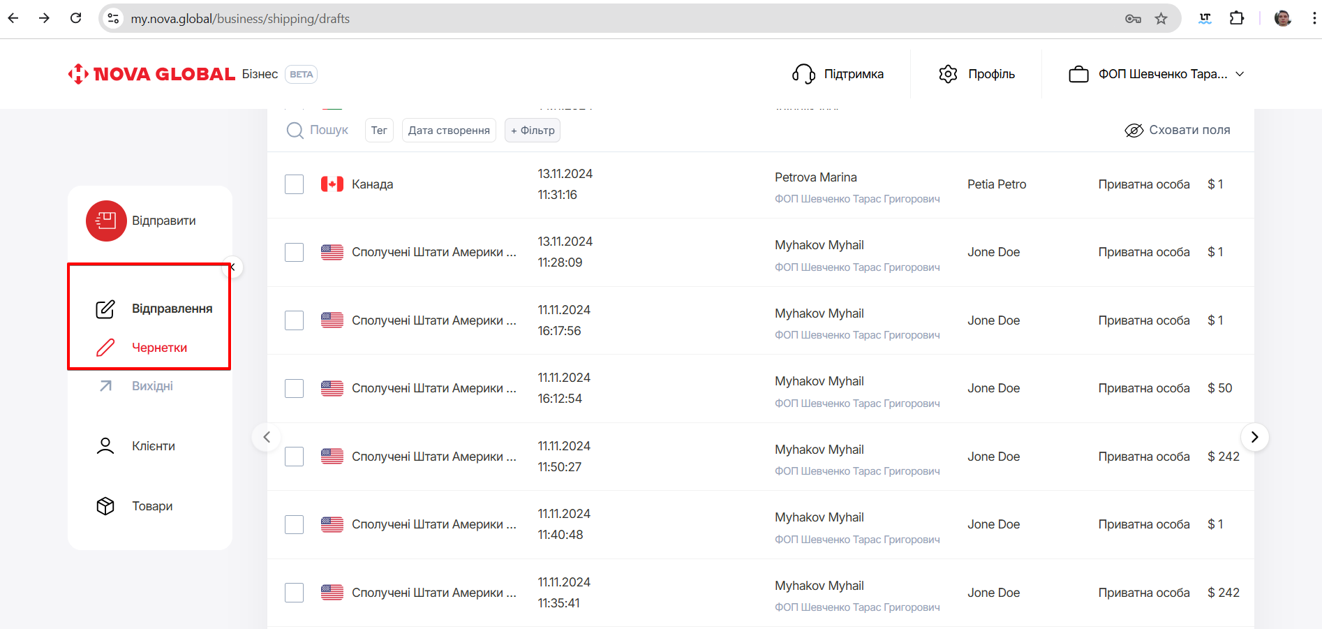 В блоці Відправлення можна окремо переглядати чернетки замовлень, керувати вихідніми відправленнями, реєструвати, редагувати, копіювати та видаляти замовлення на сторінці замовлення.