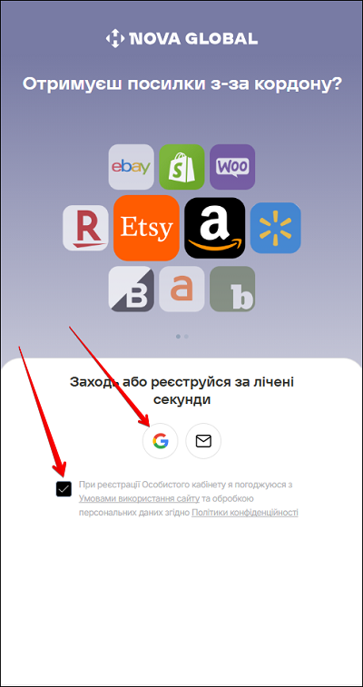 Щоб авторизуватися через Email - поставте позначку в чек боксі, якщо погоджуєтеся з умовами, та натисніть іконку ✉️.
