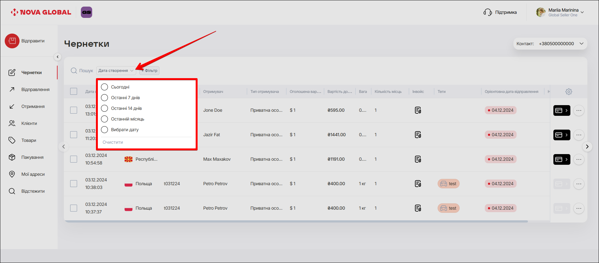 | 2 | Останні 7 днів | Відобразити відправлення за останні 7 днів |