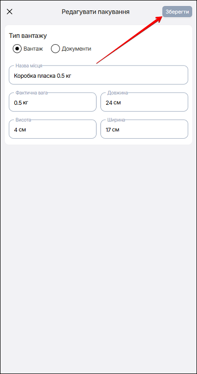 | 2 | Фактична вага | Вкажіть фактичну вагу посилки |