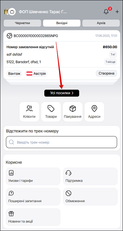 В мобільній версії, щоб переглянути всі вихідні замовлення, натисніть Усі посилки.