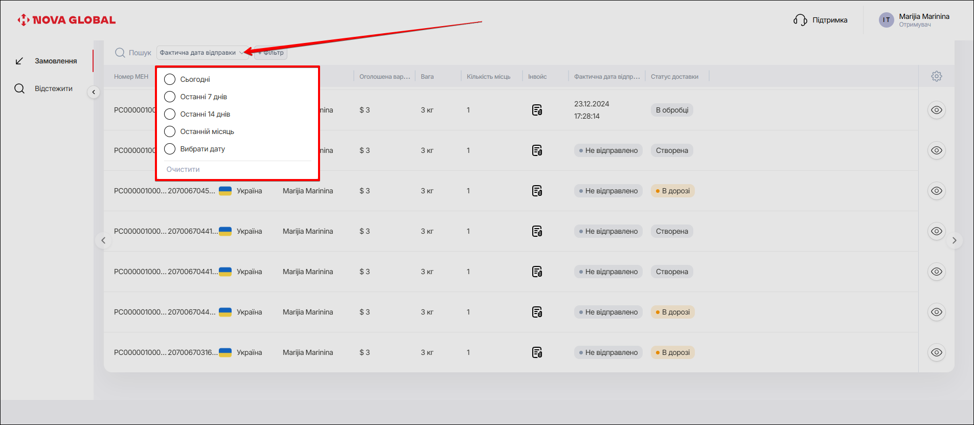 Щоб переглянути замовлення, за певними критеріями — натисніть кнопку Статус доставки, та оберіть один із запропонованих варіантів. Доступні наступні варіанти: