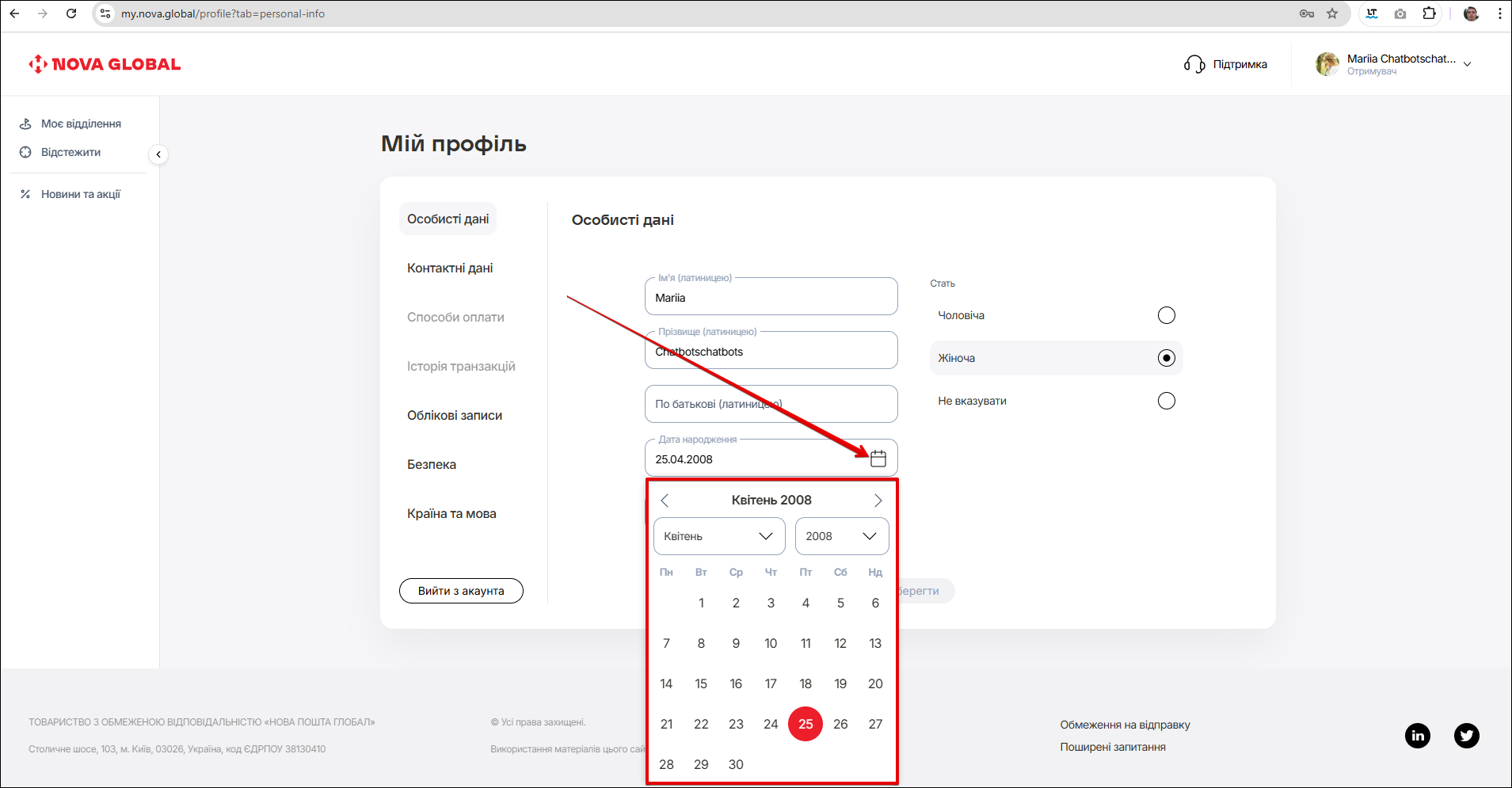 Дату народження можна обирати зі спливачого вікна. Натисніть іконку Календар, та оберіть свою дату народження.